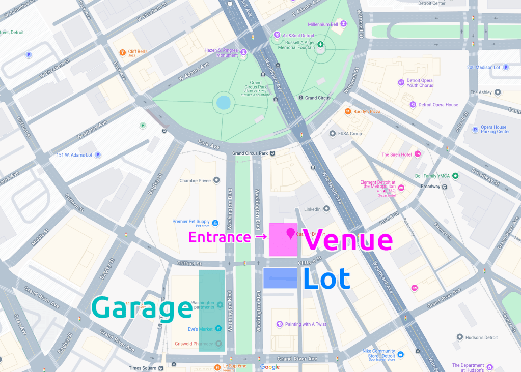 - Parking lot directly across Clifford Street south of the venue. This lot may be full depending on what else is going on downtown, and pricing is variable so it could be expensive.